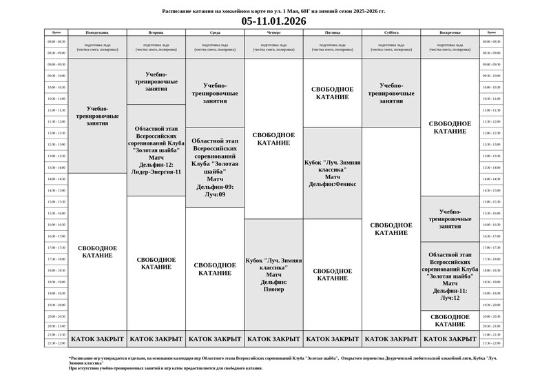 Расписание хоккейного корта с 05 по 11 января 2026 года